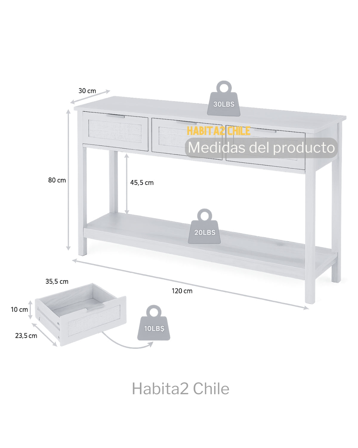 Aporta calidez y organización a tus espacios con esta elegante consola de madera con tres cajones de ratán trenzado, ideal para recibidores, pasillos, salones o dormitorios.