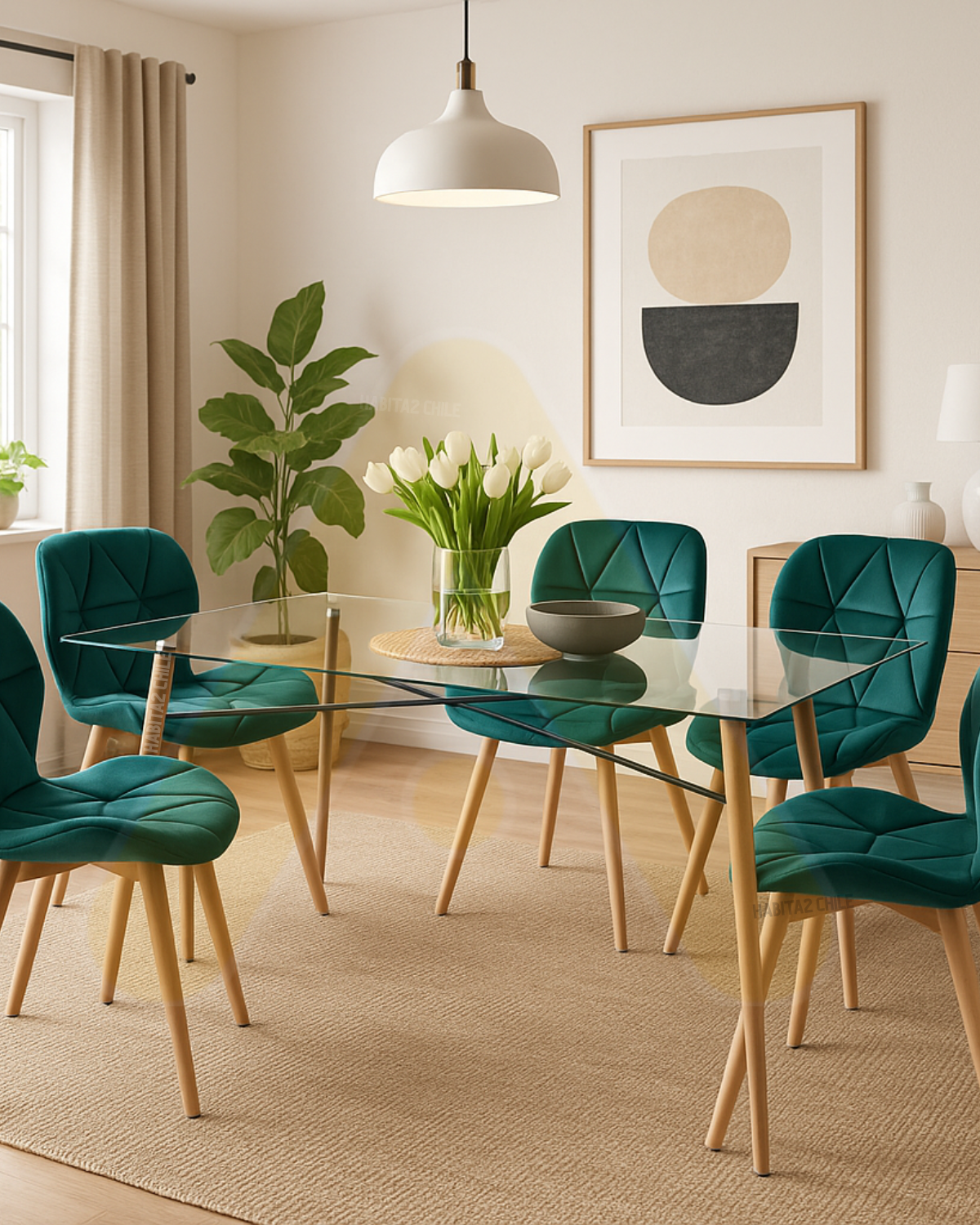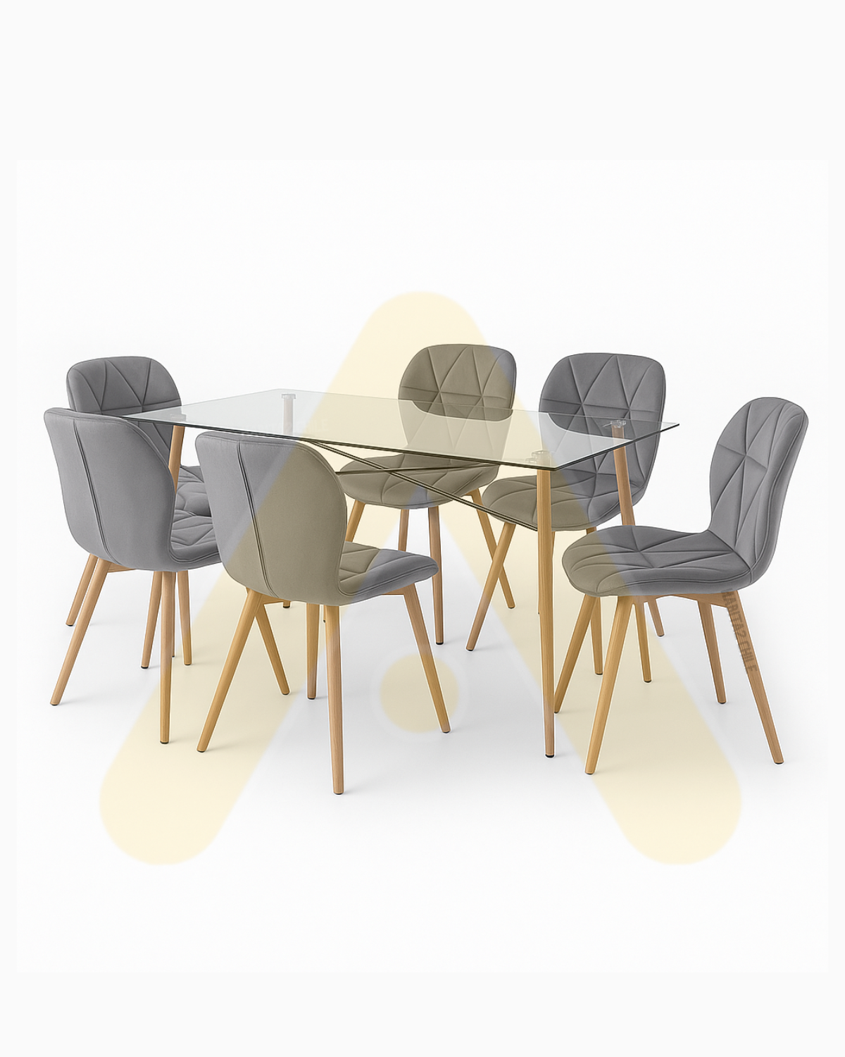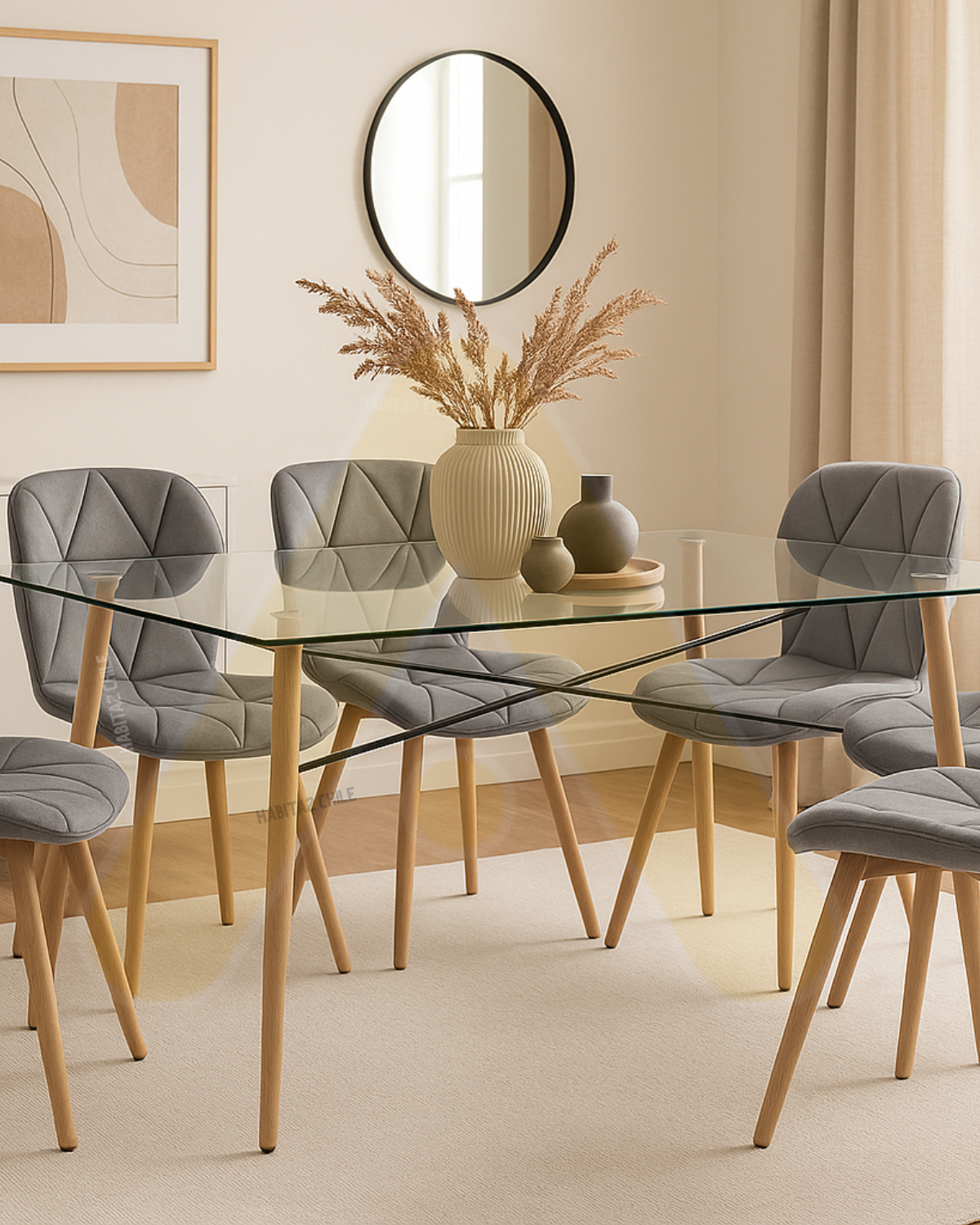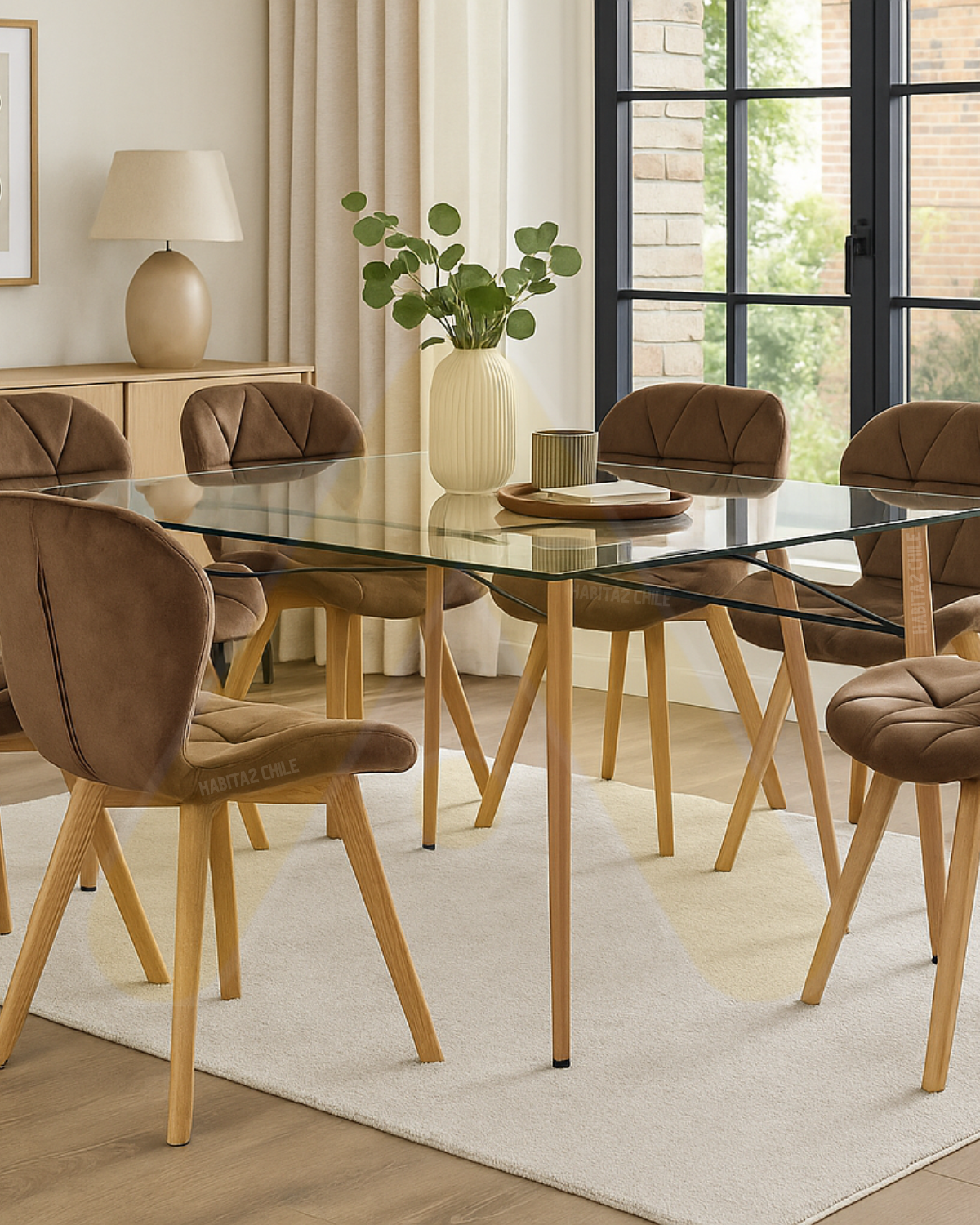 Comedor de mesa rectangular modelo de Charles Eames de medidas, vidrio templado, 140x90 cm y 77cm de alto. Medidas que convierten esta mesa en una gran opción para 4 o 6 puestos.