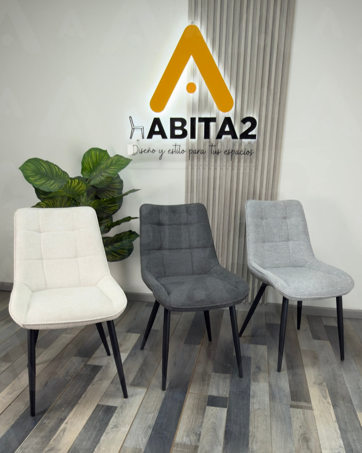 Las sillas, tapizadas en tela texturizada de alta calidad, brindan un asiento ergonómico y cómodo, con un diseño contemporáneo que se adapta tanto a ambientes minimalistas como modernos.