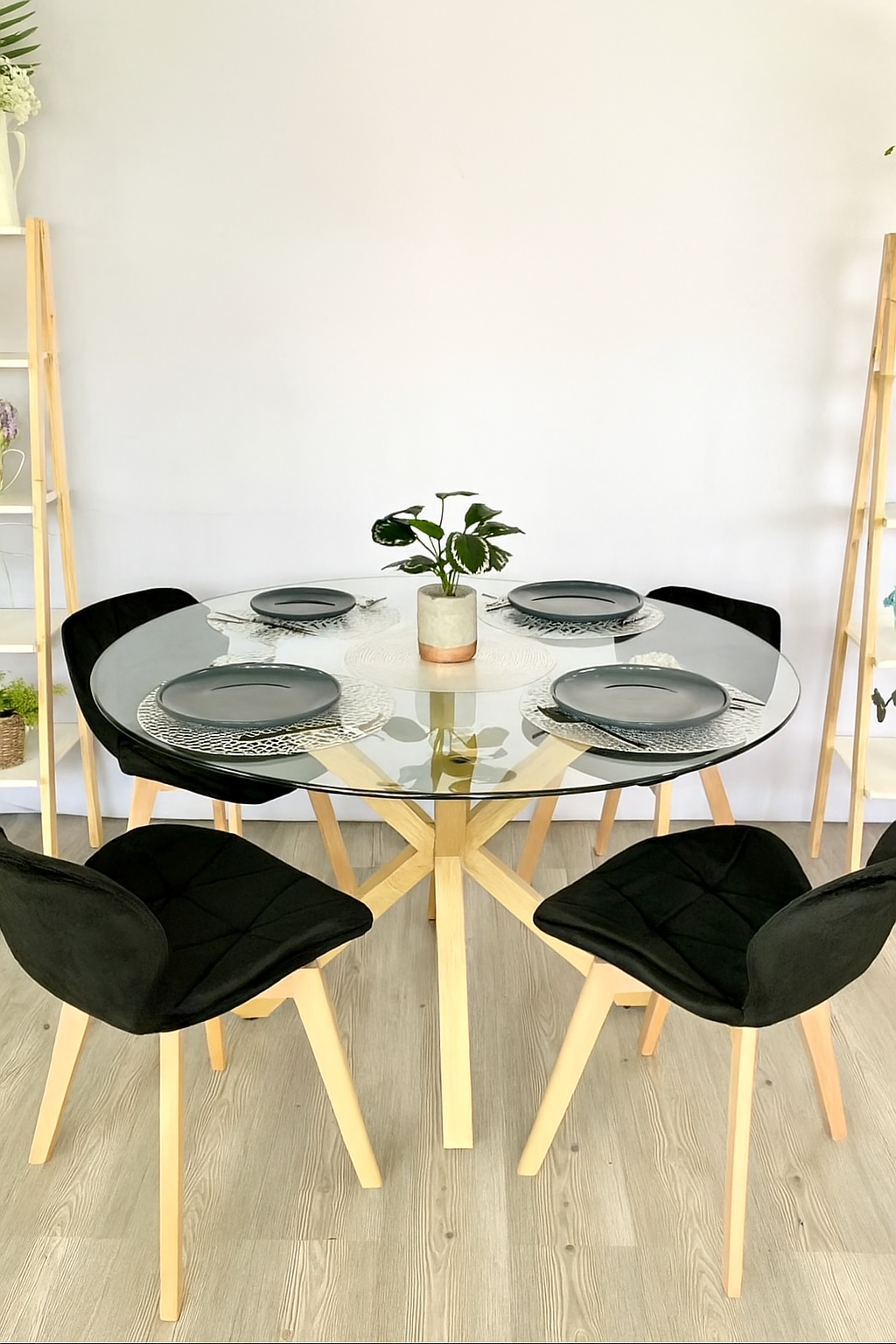 Este juego de comedor con mesa redonda cuya superficie lisa y pulida refleja la calidez de la luz, crea un ambiente acogedor. Esta mesa, perfecta para reuniones familiares o emotivas cenas, está acompañada por sillas velvet, que con su diseño ergonómico y suave tapizado, prometen confort y estilo.
