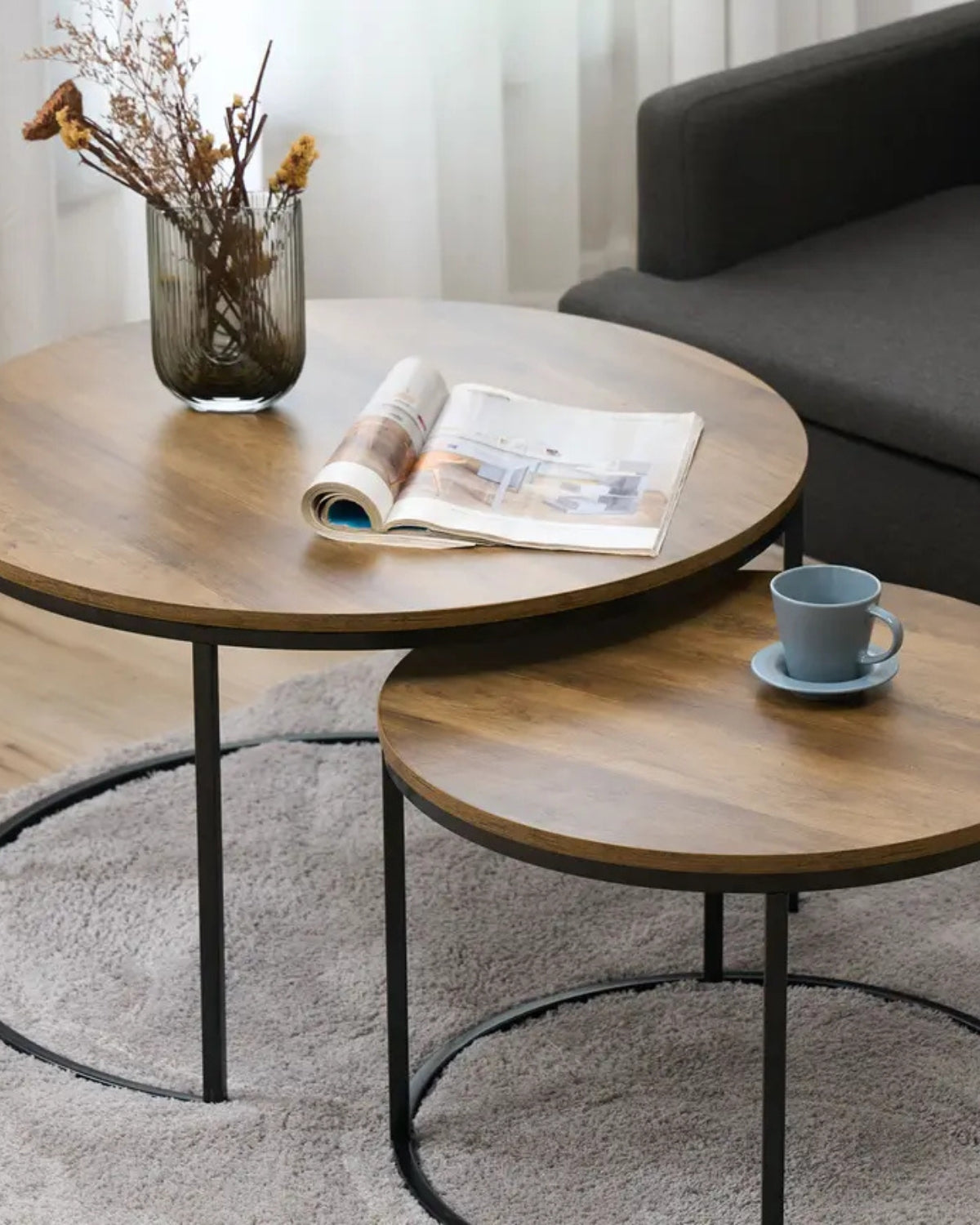 Aporta practicidad y estilo a tu sala con este set de 2 mesas de centro tipo nido, perfectas para adaptarse a cualquier espacio. Su diseño minimalista combina cubiertas de MDF con acabado en madera y estructuras metálicas en color negro, logrando un look moderno e industrial que encaja en múltiples estilos decorativos.