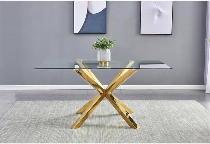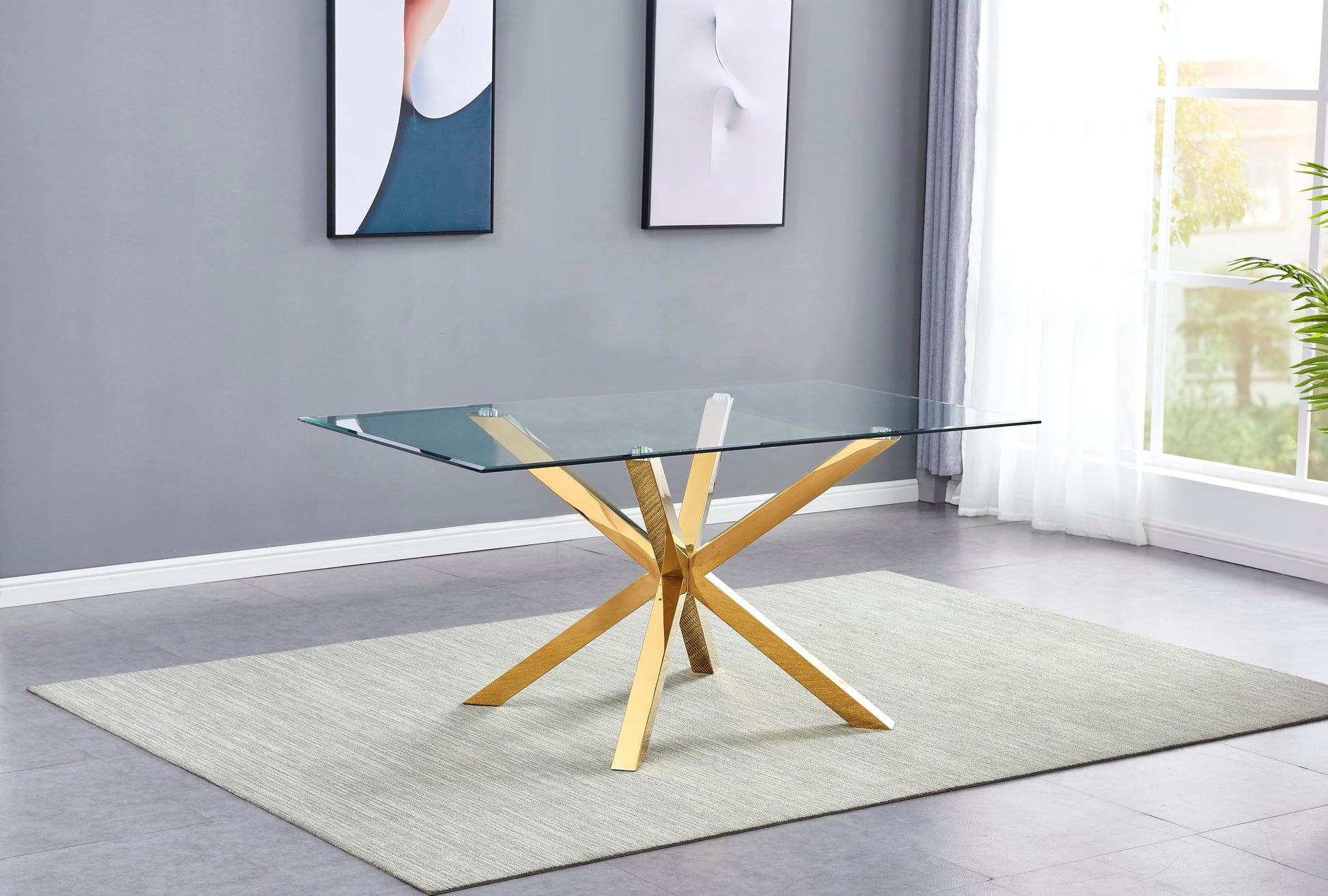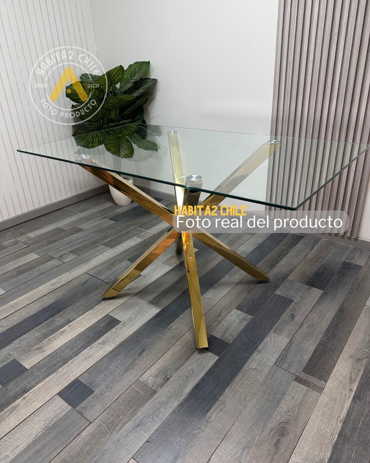 Elegante mesa de comedor rectangular con una cubierta de vidrio templado y patas de acero inoxidable con terminación dorado brillante y topes anti deslizantes ofrecen estabilidad y permite ajustar el nivel en cada pata.