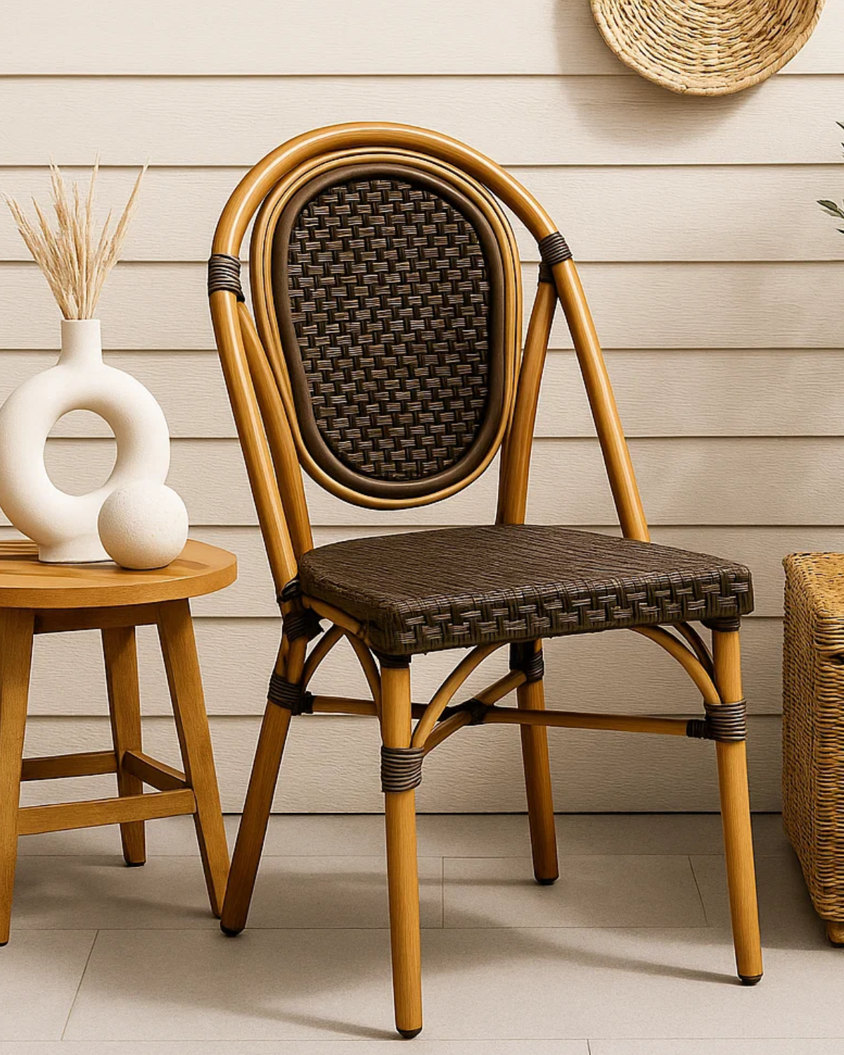 La Silla de Ambigú aporta elegancia y sofisticación a terrazas, balcones o jardines. Su estructura metálica dorada asegura resistencia y un look chic, mientras el asiento y respaldo en ratán sintético oscuro ofrecen comodidad y durabilidad frente al sol y la humedad. Inspirada en el encanto parisino, es perfecta para dar un toque clásico y atemporal a tus espacios al aire libre. ¡Una silla resistente, estilosa y funcional para disfrutar al máximo!